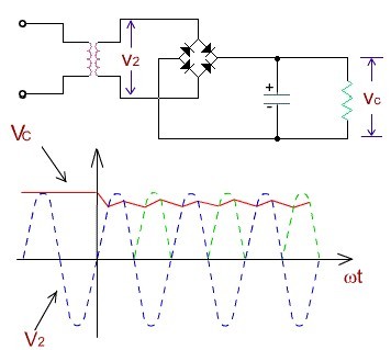 (1)電容濾波,所示在負(fù)載電阻上并聯(lián)了一個濾波電容C。電容是隔直通交,電壓不能突變。所以只能并聯(lián)在電路中,直流電從負(fù)載過,交流電就從電容過,從而達到濾波的目的。由于電容的儲能作用,使得輸出波形比較平滑。電容放電的時間τ=RLC越大,放電過程越慢,輸出電壓中脈動 (紋波:是主電流信號附帶的雜訊成分,小幅度交流電,無法完全隔絕,一般要求在主電壓的1%內(nèi)即可,如供電12V,那么要求電源的紋波不能大于120毫伏) 成分越少,濾波效果越好(電壓平滑)。
