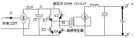 由電路可以看出,市電經(jīng)整流濾波后變?yōu)?11V高壓,經(jīng)K1~K4功率開關(guān)管有序工作后,變?yōu)槊}沖信號加至高頻變壓器的初級,脈沖的高度始終為311V。當K1,K4開通時,311V高壓電流經(jīng)K1正向流入主變壓器初級,經(jīng)K4流出,在變壓器初級形成一個正向脈沖,同理,當K2,K3開通時,311V高壓電流經(jīng)K3反向流入主變壓器初級,經(jīng)K2流出,在變壓器初級形成一個反向脈沖。這樣,在變壓器次級就形成一系列正反向脈沖,經(jīng)整流濾波后形成直流電壓。當輸出電壓Uo較高時,脈沖寬度就寬,當輸出電壓Uo較低時,脈沖寬度就窄,因此開關(guān)管實際上是一個控制脈沖寬窄的裝置。